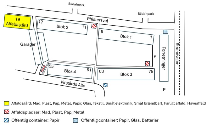 - på fortovet foran affaldsgården på Phistersvej 19 (se skilt på plankeværket) eller